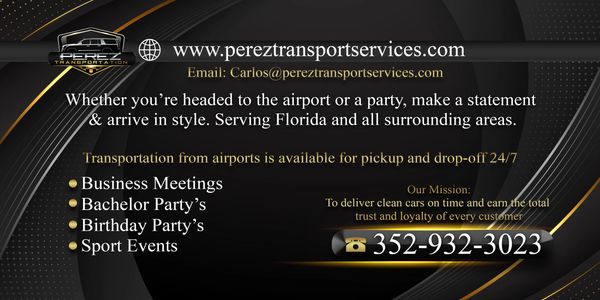 Perez Transportation LLC provides airport shuttle and transportation services serving Florida and surrounding areas. Whether you're headed to the airport or a party, make a statement and arrive in style. Offering 24/7 pickup and drop-off from airports, as well as transportation for Business Meetings, Corporate Events, Bachelor Party's, Proms, Birthday Party's, Sports Events.